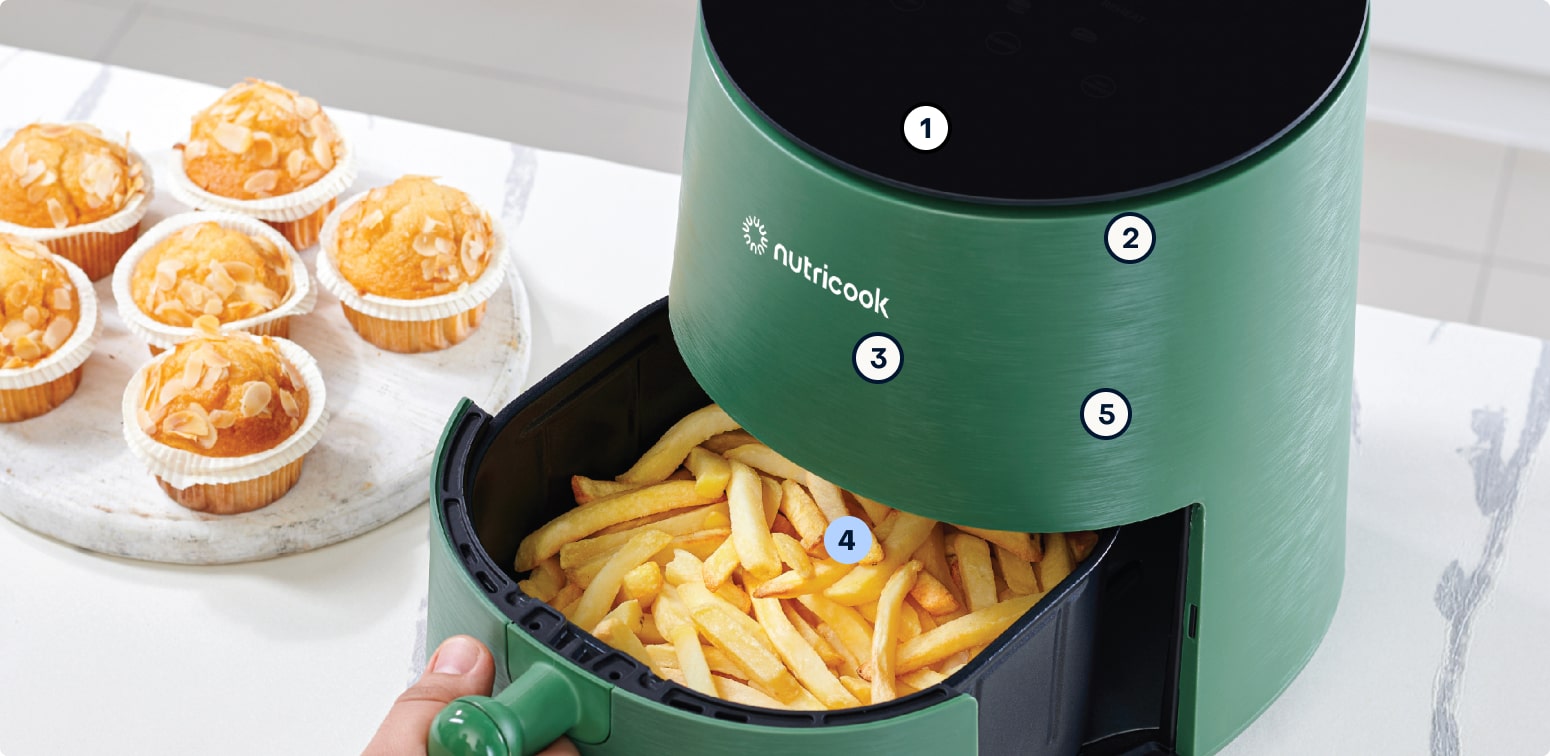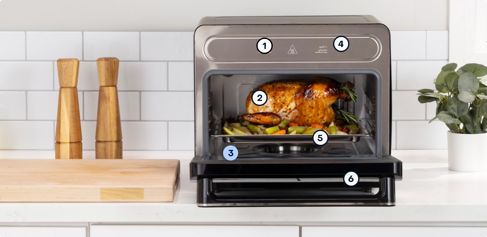 Creates and traps up to 265°C of superheated air to cook food quickly.