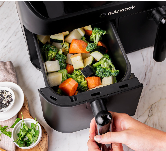 The air fryer basket is PFOA/BPA-free and dishwasher